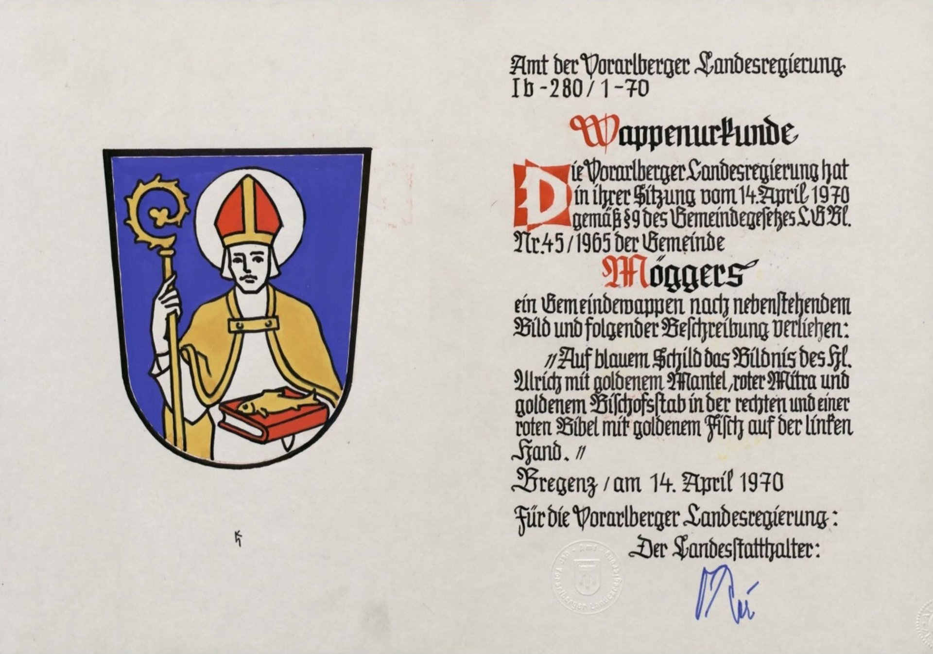 Die Wappenurkunde ist auf den 14. April 1970 ausgestellt.32. Feinkäserei Bantel, Möggers Die Weichkäseerzeugung der Familie Bantel unter dem Markennamen Berggold ist weit über die Landesgrenzen hinaus bekannt. Schon seit 1945 wird feinster Camembert im Familienbetrieb produziert. Zahlreiche Auszeichnungen konnten damit errungen werden.