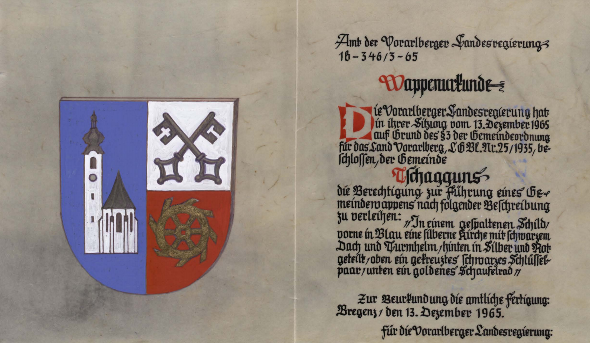 In einem gespaltenen Schild, vorne in Blau eine silberne Kirche mit schwarzem Dach und Turmhelm, hinten in Silber und Rot geteilt, oben ein gekreuztes schwarzes Schlüsselpaar, unten ein goldenes Schaufelrad.Pfarrkirche Tschagguns Tschagguns ist seit 1339 eine eigene Pfarre. Die Pfarrkirche wurde 1452 bis 1454 erbaut, 1598, 1751 bis 1752 und 1812 bis 1814 erweitert. Sie vereint mehrere Stilrichtungen, ist Mariä Geburt geweiht und das Wahrzeichen der Gemeinde.