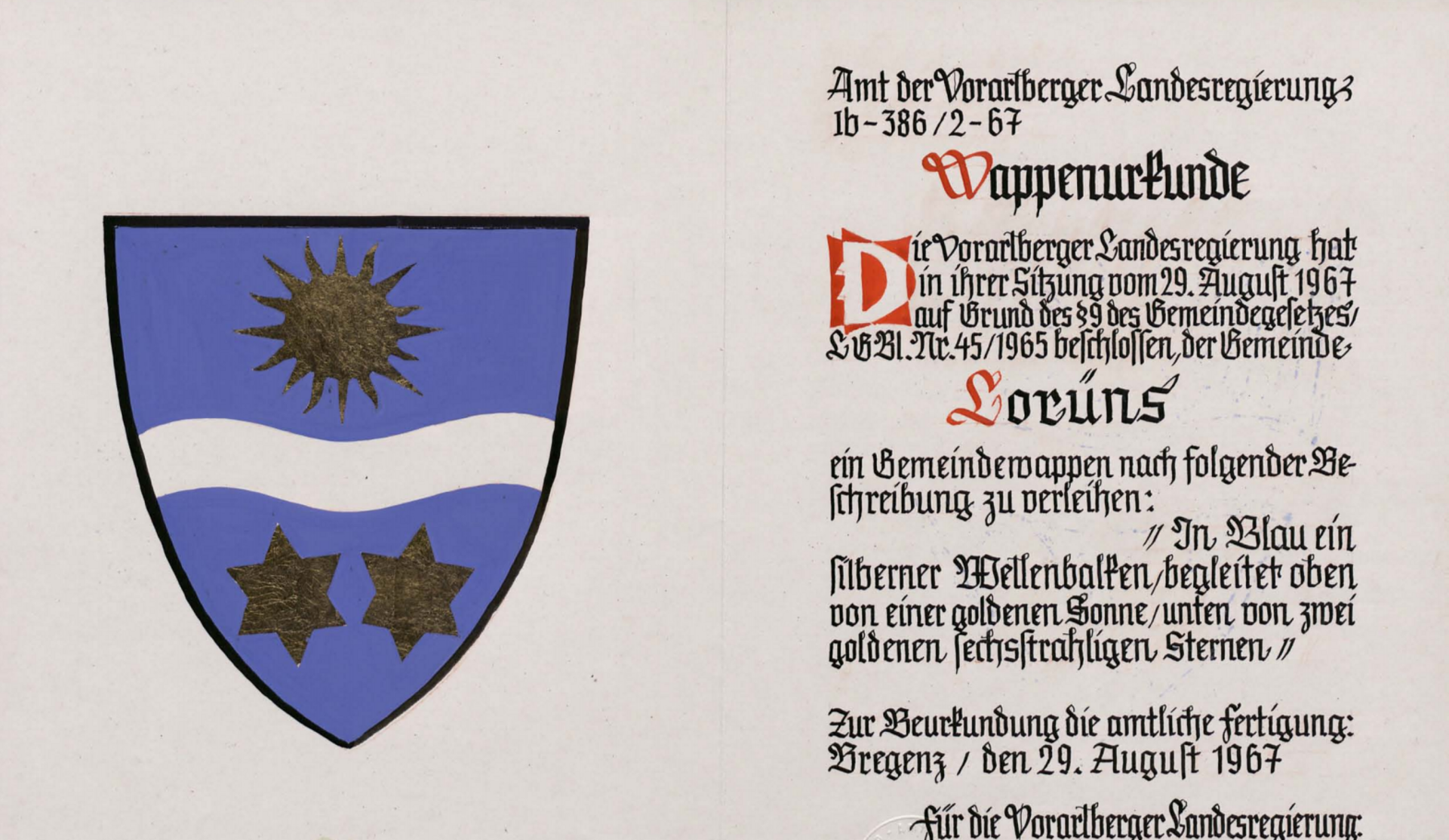 Zahlen und Daten Bevölkerung: 299 Fläche: 8,36 km2 Lage: 298 m.ü.A. Wappen von Lorüns Der Gemeinde Lorüns wurde am 29. August 1967 dieses Wappen verliehen.