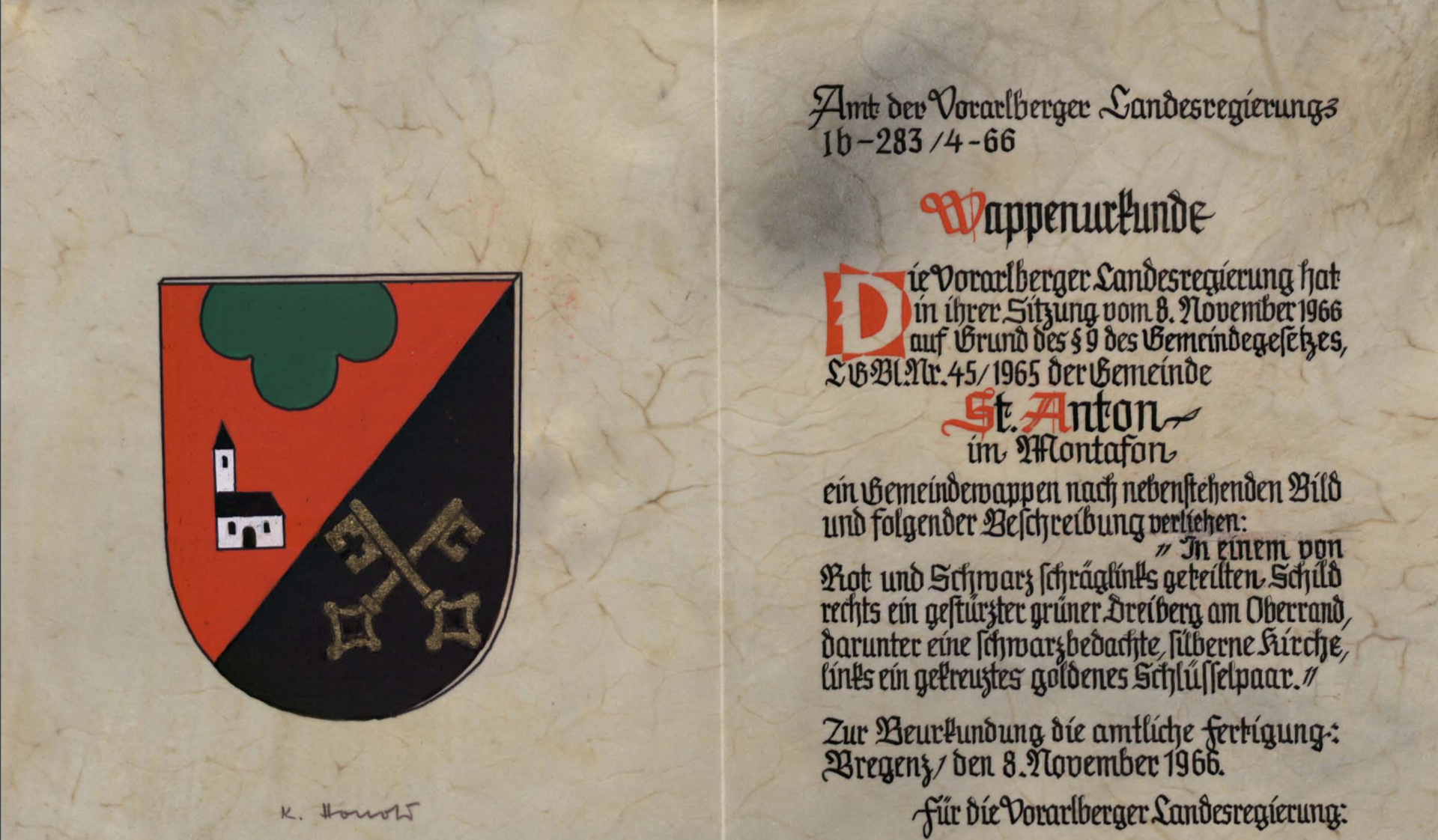 In einem von Rot und Schwarz schräglinks geteilten Schild rechts ein gestürzter grüner Dreiberg am Oberrand, darunter eine schwarzbedachte, silberne Kirche, links ein gekreuztes goldenes Schlüsselpaar.Pfarrkirche St. Anton Die heutige Pfarrkirche soll auf den Grundmauern einer vermurten Kapelle aufgebaut worden sein. Doch die Siedlung um die ehemalige Kapelle wurde aufgelassen und in die Schutz bietende Mulde des „Mühlibaches“ (Graveser Baches) verlegt. Nach der Trennung von der Mutterkirche Bludenz wurde St. Anton 1646 eine eigene Pfarrei.
