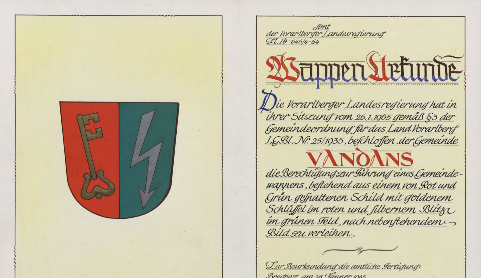 Ein von Rot über Grün gespaltener Schild mit goldenem Schlüssel in rotem und silbernem Blitz im grünen Feld.Alte und neue Pfarrkirche von Vandans Die alte Pfarrkirche von Vandans war eine Filialkirche von Tschagguns, bis Vandans 1651 eine selbstänige Pfarre wurde. Eine Kapelle von 1491 wird 1614 vergrößert und 1777 und 1792 erneuert. Die Kirche ist geschlossen und ohne Einrichtung.