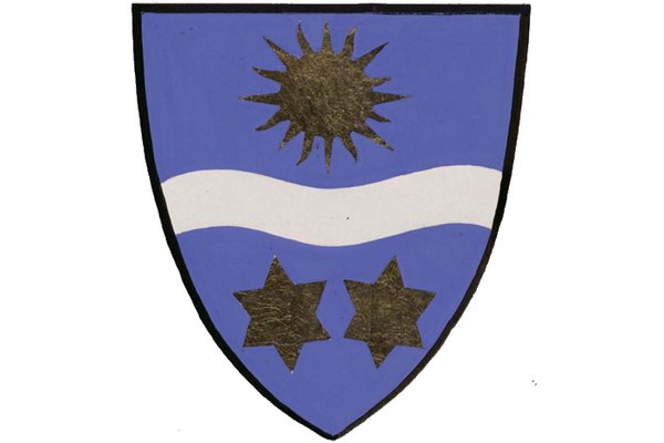 In Blau ein silberner Wellenbalken, begleitet oben von einer goldenen Sonne, unten von zwei goldenen sechsstrahligen Sternen.