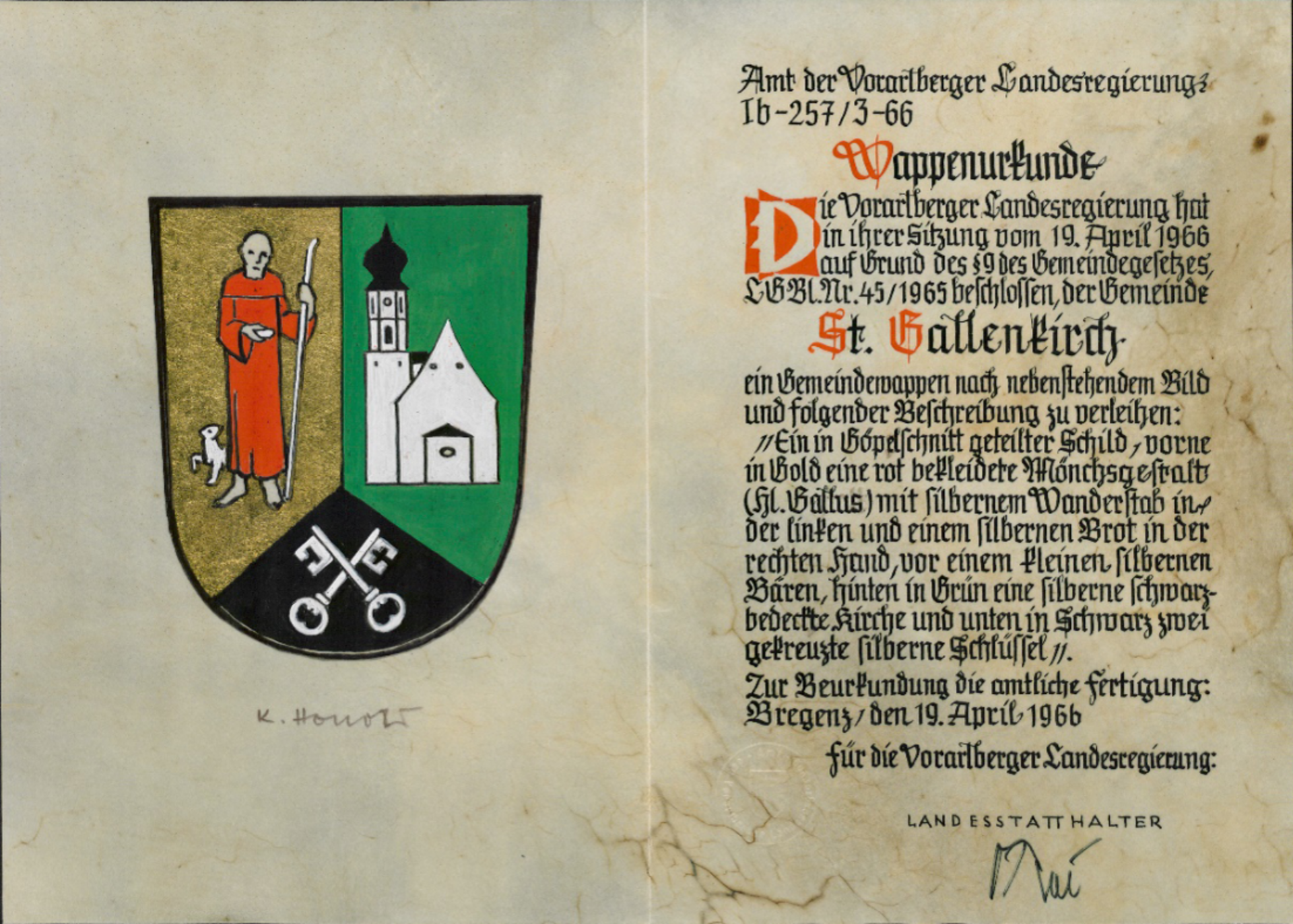 Ein in Göppelschnitt geteilter Schild, vorne in Gold eine rot bekleidete Mönchsgestalt (hl. Gallus) mit einem silbernen Wanderstab in der linken und einem silbernen Brot in der rechten Hand, vor einem kleinen silbernen Bären, hinten in Grün eine silberne schwarzbedeckte Kirche und unten in Schwarz zwei gekreuzte silberne Schlüssel.Pfarrkirche St. Gallenkirch 1307 wurde in St. Gallenkirch eine Kapelle als Filialkirche von Bludenz erbaut. 1483 kam es zur Gründung der eigenen Pfarre. Die Kirche wurde 1474 errichtet, 1669 der Turm erhöht und das Gebäude 1780 bis 1790 baulich verändert. Der gotische Chor wurde barockisiert. Dank der drei marmorierten Holzaltäre, der Kanzel und dem Orgelgehäuse zählt sie zu den schönsten Rokokokirchen Vorarlbergs.