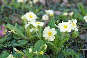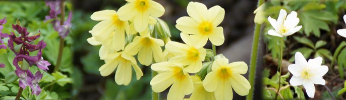 Gartenblumen Primel, Tulpe, Hyazinthe und Narzisse sind im Frühling in vielen Gärten und - außer der Primel - in vielen Innenräumen als Schnittblumen zu sehen. Sie sind gezüchtete und keine Wildblumen.