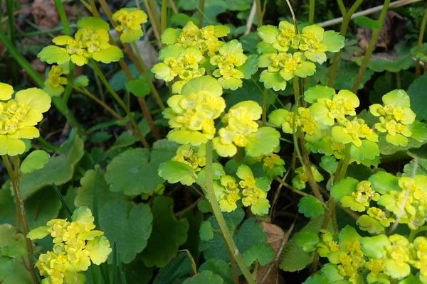 Wechselblättriges Milzkraut Beschreibung Die gelben Blüten des Milzkrauts wachsen in Dolden.
