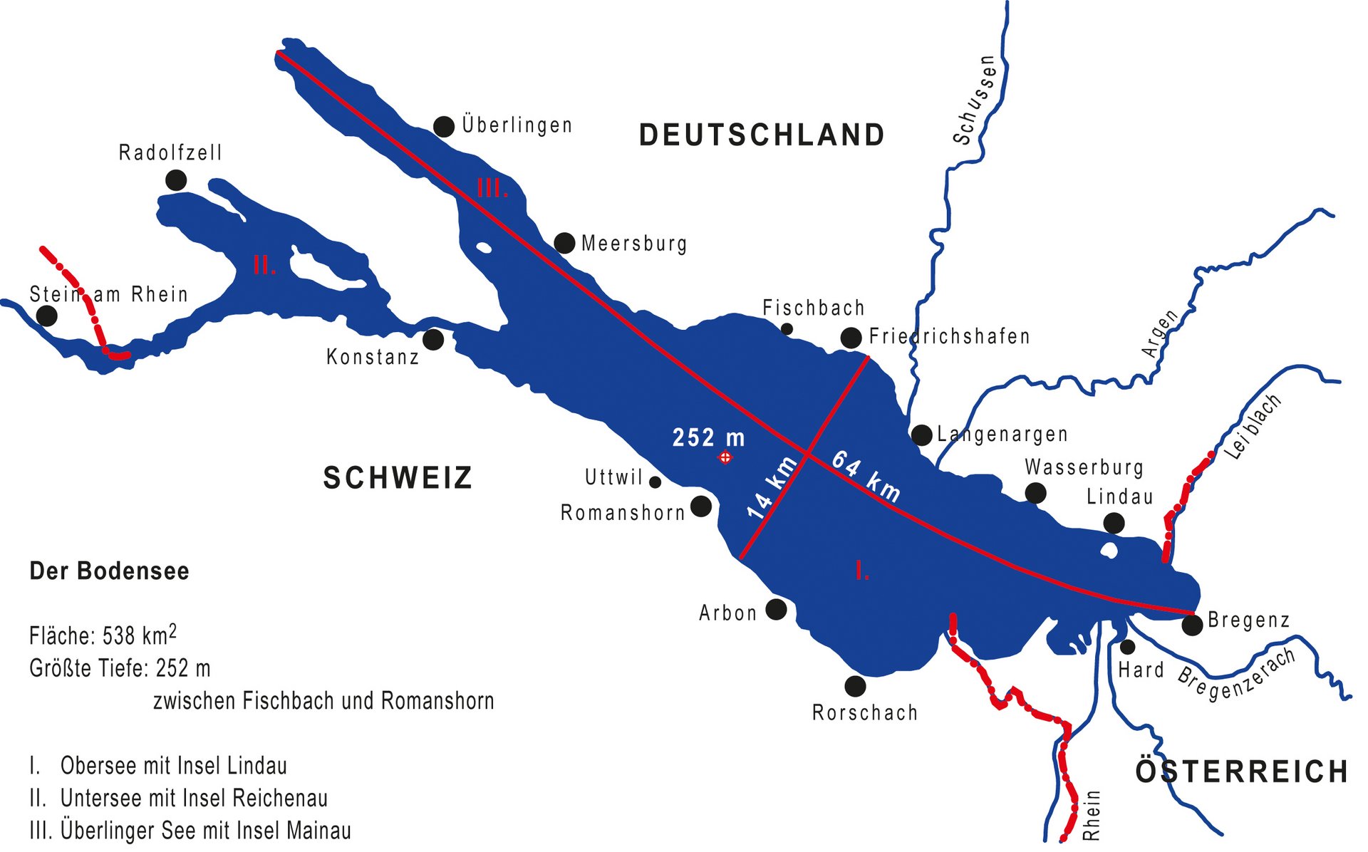 Sie zogen vermutlich am nördlichen Bodenseeufer entlang in das Rheintal, wo sie mit ihren Familien eine Bleibe fanden. Sie gründeten Markgenossenschaften und brachten deutsche Sprache und deutsches Brauchtum mit.Staatsgrenzen Der Überlingersee ist deutsches Staatsgebiet. Der Untersee ist durch Staatsverträge von 1854 und 1878 zwischen Deutschland und der Schweiz aufgeteilt. Für den Obersee wurden keine Staatsgrenzen festgelegt, keine völkerrechtlich relevante Einigung erzielt. Die gelebte Teilung beruht auf Gewohnheitsrecht. Dies ist einzigartig in Europa.