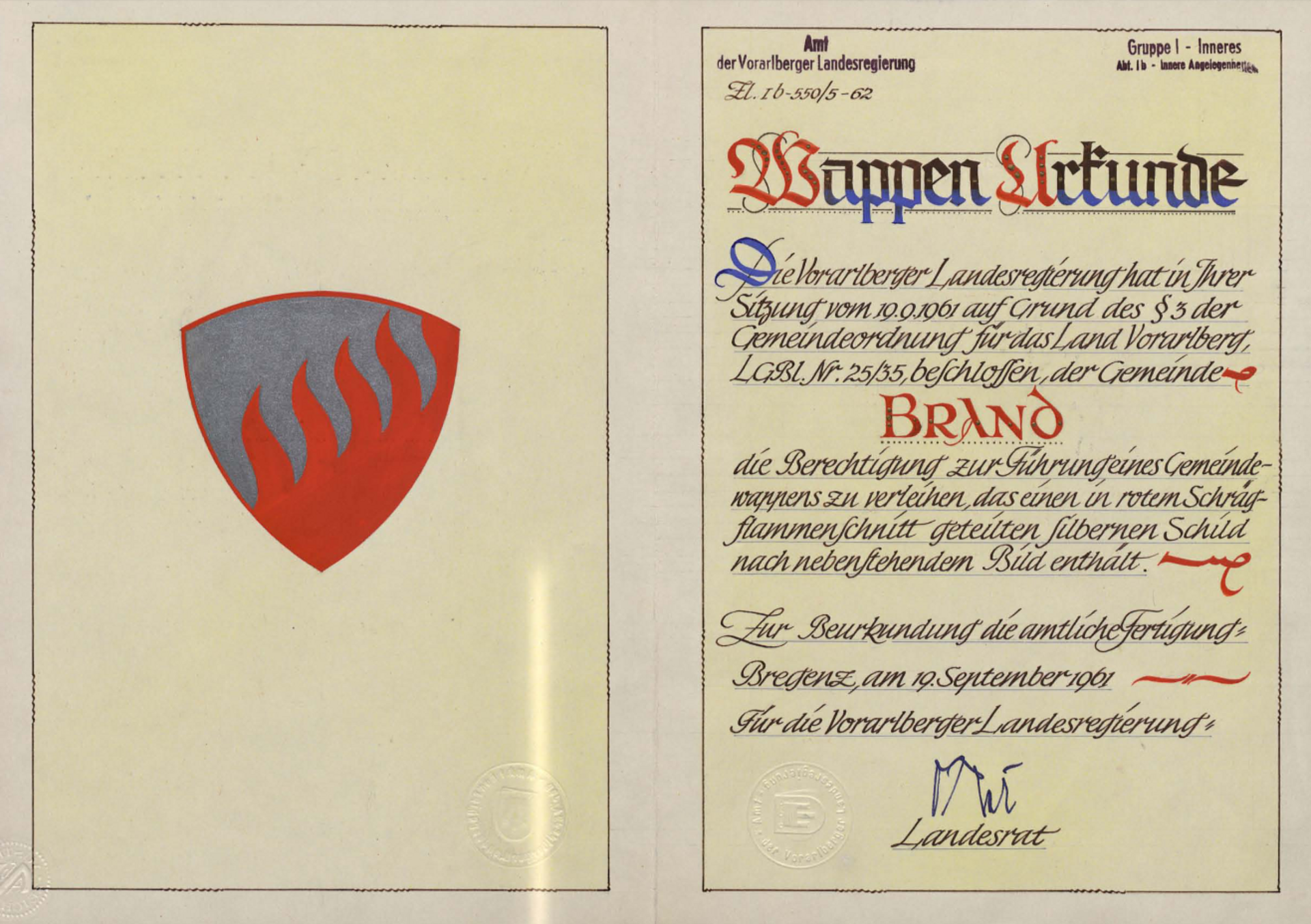 Die Verleihung wurde am 19. September 1961 ausgestellt.Pfarrkirche Brand Im Jahre 1410 stiften zwei ansässige Bauern von Brand, Hensli Alaman und sein Sohn Jösli, das ihnen gehörende Gut für eine Kapelle. 1423 wird sie zu Ehren der Muttergottes eingeweiht. Brand gehört pfarrlich noch zu Bürs, bekommt aber 1476 einen ständigen Priester. 1478 wird mit dem Bau der Kirche begonnen, 1507 wird sie eingeweiht. Brand wird 1727 eigene Pfarrei.