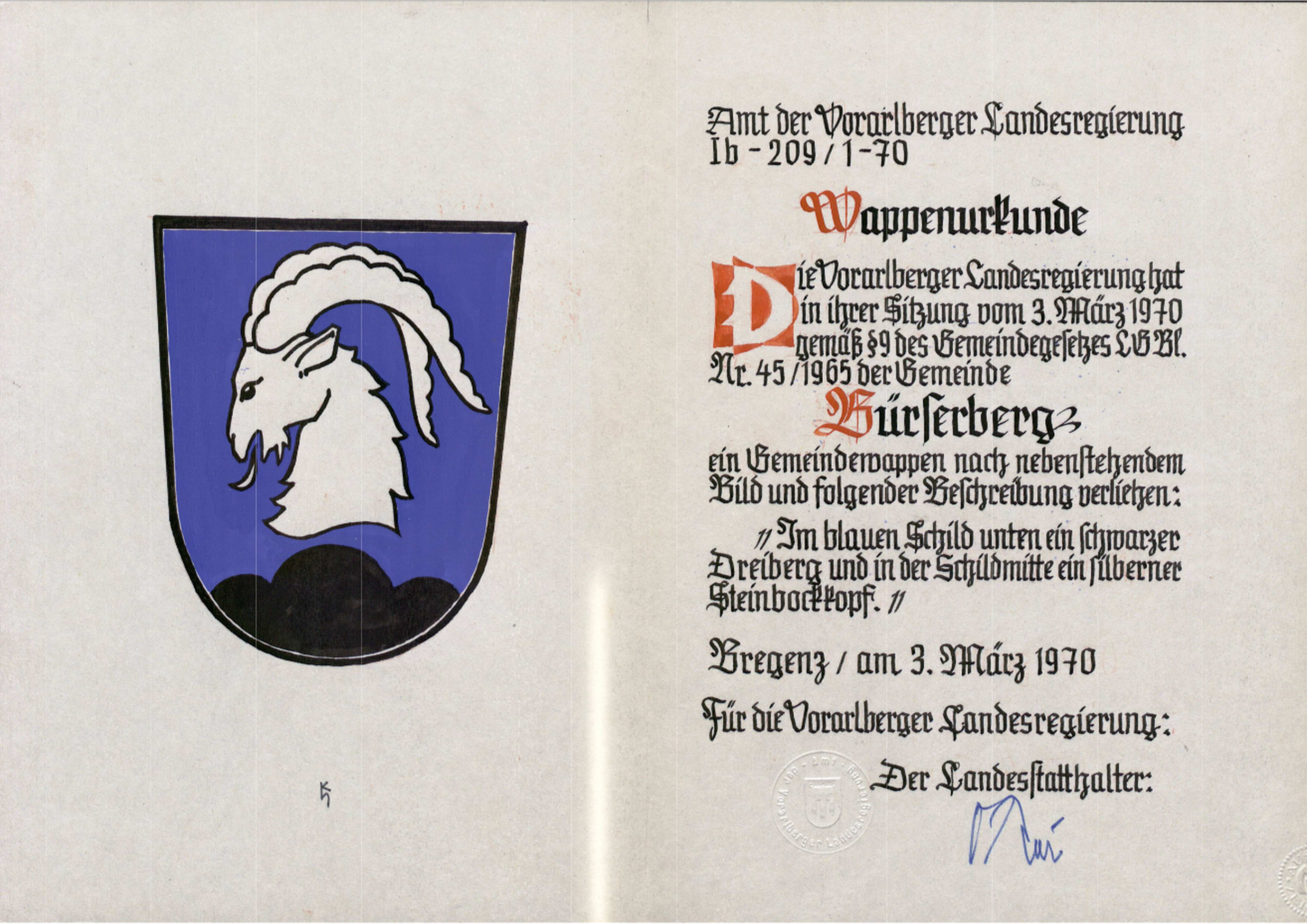 Die Verleihungsurkunde ist auf den 3. März 1970 datiert.Pfarrkirche Bürserberg 1711 wird eine Kapelle errichtet und dem hl. Antonius geweiht. 1730 wird eine Kirche fertiggestellt und dem hl. Josef geweiht. 1736 wird Bürserberg, vorher zu Bürs gehörend, als Pfarrei selbständig.